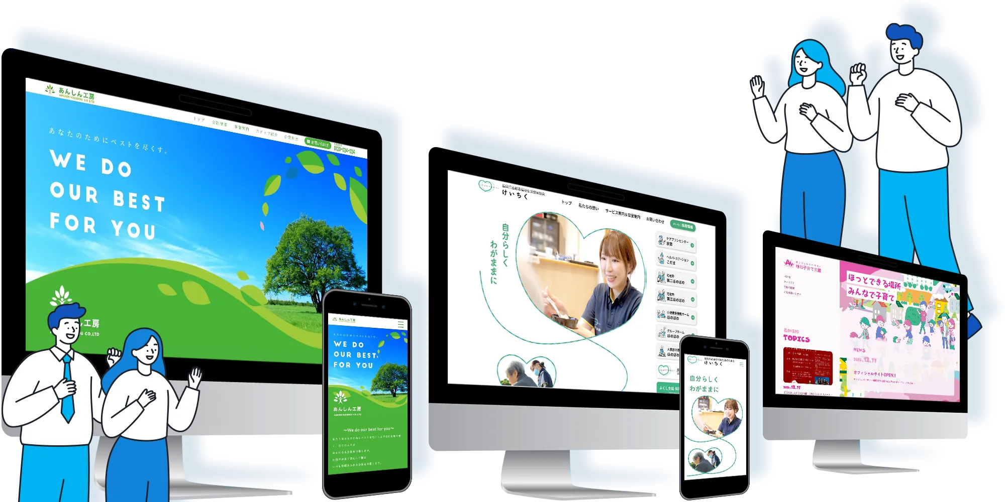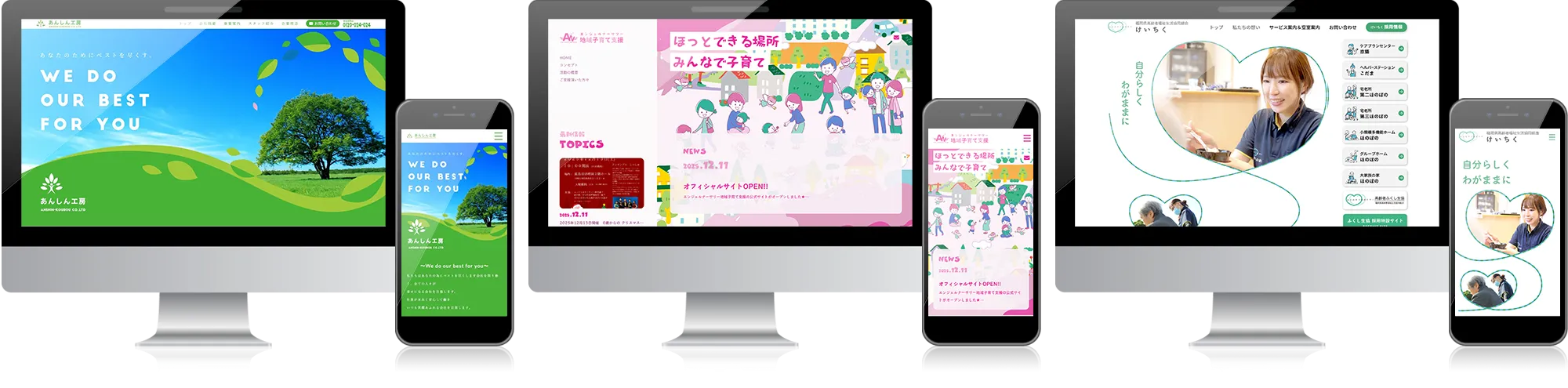 スマホ・タブレット対応レスポンシブデザインで、PCはもちろんスマホやタブレットでも見やすいサイトを標準提供。
